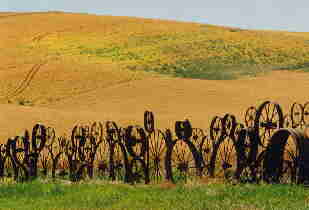A fence in Southeastern Washington made of over a thousand old wheels. This scenic area of rolling hills is known for producing much of the nations wheat.